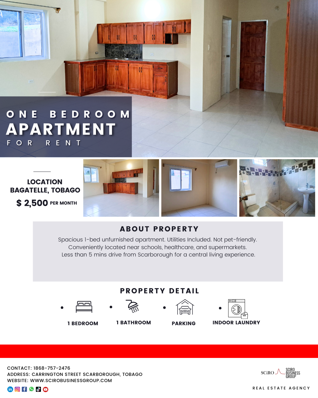 This unfurnished one-bedroom apartment is awaiting your personal touch. With a huge open plan design, AC units, H/C showers and electricity costs included. Not pet friendly, Wifi not included can be added at $300 per month additional. This unit is perfect for a professional or young couple. Plus, with a location less than a 5-minute drive from Scarborough, you’ll enjoy proximity to schools, healthcare, supermarkets and all the benefits of a central and well-connected living experience.
